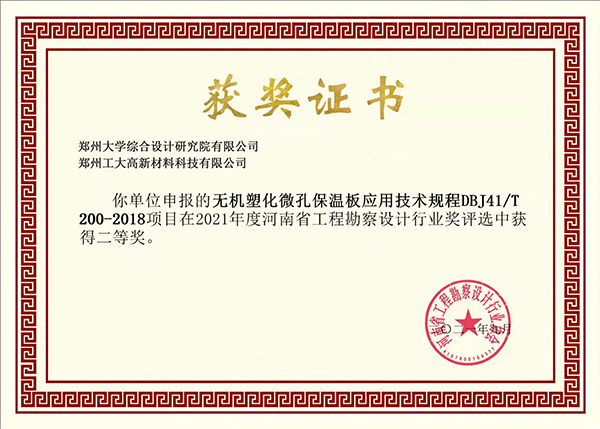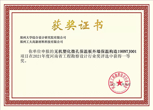 近日,“2021年度河南省工程勘察設(shè)計(jì)行業(yè)獎(jiǎng)評(píng)選”揭曉,由鄭州大學(xué)綜合設(shè)計(jì)研究院有限公司與我司共同申報(bào)的“無機(jī)塑化微孔保溫板外墻保溫構(gòu)造19HNTJ001”、“無機(jī)塑化微孔保溫板應(yīng)用技術(shù)規(guī)程DBJ41/T 200-2018”項(xiàng)目分別榮獲一、二等獎(jiǎng)。