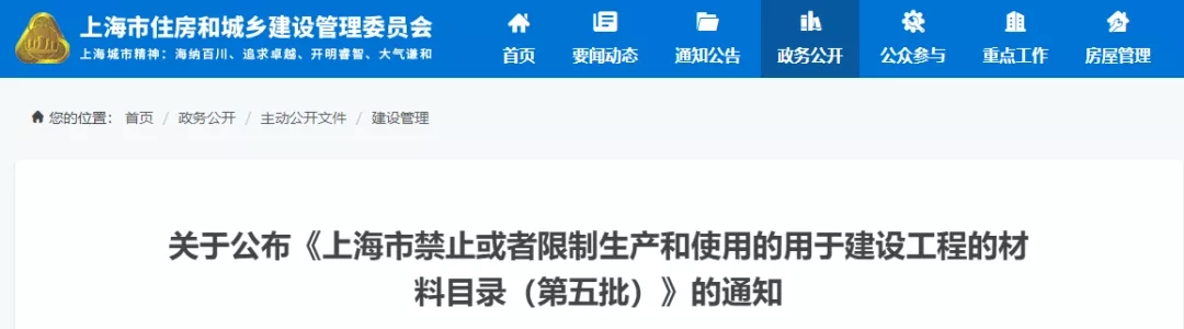 10月13日,上海市住房和城鄉建設管理委員會發布通知,公布了《上海市禁止或者限制生產和使用的用于建設工程的材料目錄(第五批)》。2020年11月1日前未通過施工圖設計文件審查備案的項目以及2020年12月31日前尚未開始墻體節能工程施工的項目嚴格執行