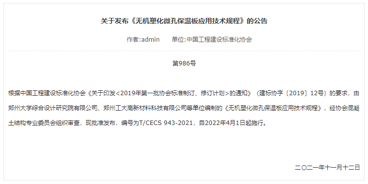 由鄭州大學(xué)綜合設(shè)計(jì)研究院有限公司、我司主編,中國建筑科學(xué)研究院有限公司等十七家單位參編的《無機(jī)塑化微孔保溫板應(yīng)用技術(shù)規(guī)程》(以下簡(jiǎn)稱:《規(guī)程》)近日發(fā)布,自2022年4月1日起施行。