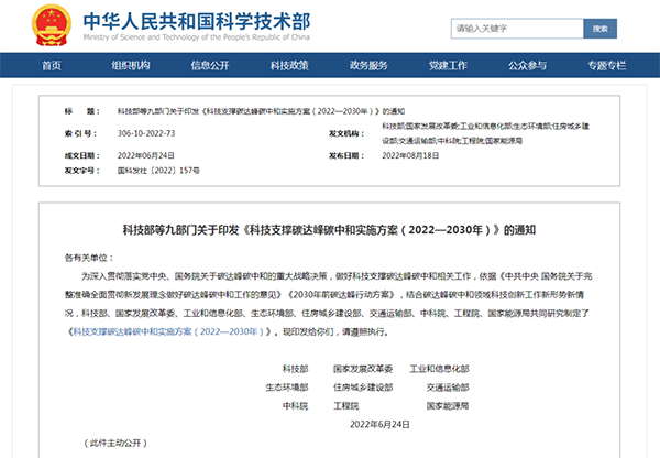 記者17日從科技部獲悉,科技部、國家發展改革委、工業和信息化部等9部門近日印發《科技支撐碳達峰碳中和實施方案(2022—2030年)》(以下簡稱《實施方案》),統籌提出支撐2030年前實現碳達峰目標的科技創新行動和保障舉措,并為2060年前實現碳中和目標做好技術研發儲備。