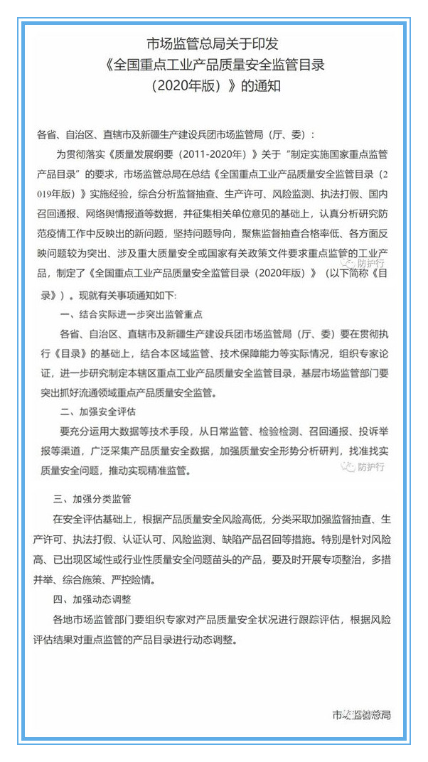 近日,市場監(jiān)管總局對《全國重點工業(yè)產(chǎn)品質(zhì)量安全監(jiān)管目錄(2019年版)》實施經(jīng)驗進行總結(jié),綜合分析數(shù)據(jù),結(jié)合實際情況,征集相關(guān)單位意見,制定了《全國重點工業(yè)產(chǎn)品質(zhì)量安全監(jiān)管目錄(2020年版)》。
