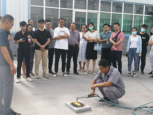 在車間外,我司工作人員現場演示了無機塑化微孔保溫板的吸水性、防火性、熱工性能等特點,引起設計院專家的嘖嘖稱贊。